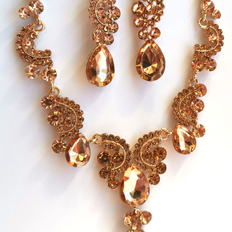 This luxurious set features an ornate statement necklace adorned with shimmering stones and a dramatic teardrop centrepiece, paired with elegant matching earrings. The gold-tone alloy creates a regal, radiant effect, making the set perfect for weddings, celebrations, parties, and evening occasions.